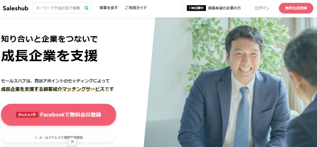 Saleshubは、営業職などのビジネスパーソンが「サポーター」として企業向けに顧客候補を紹介するサービスです。会いたい企業名や部署、役職を指定すると、その企業とつながりのあるサポーターと自動的にマッチングします。