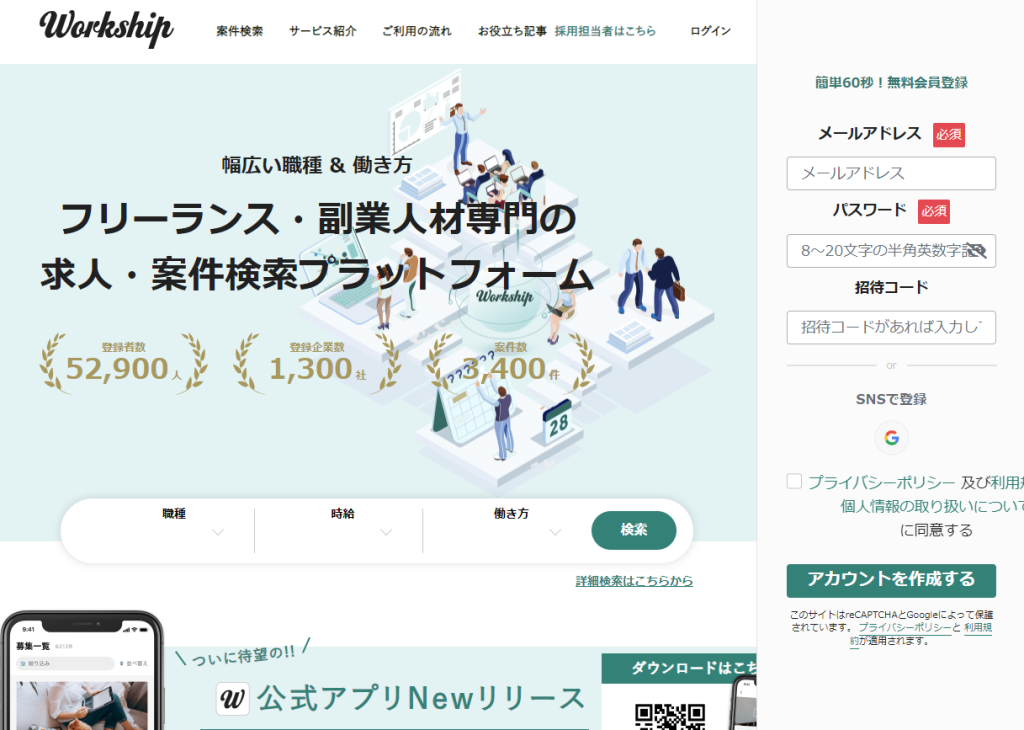 Workshipは、フリーランス登録者数52,800名以上、導入企業1,300社以上の、企業とフリーランスのビジネスマッチングサイトです。