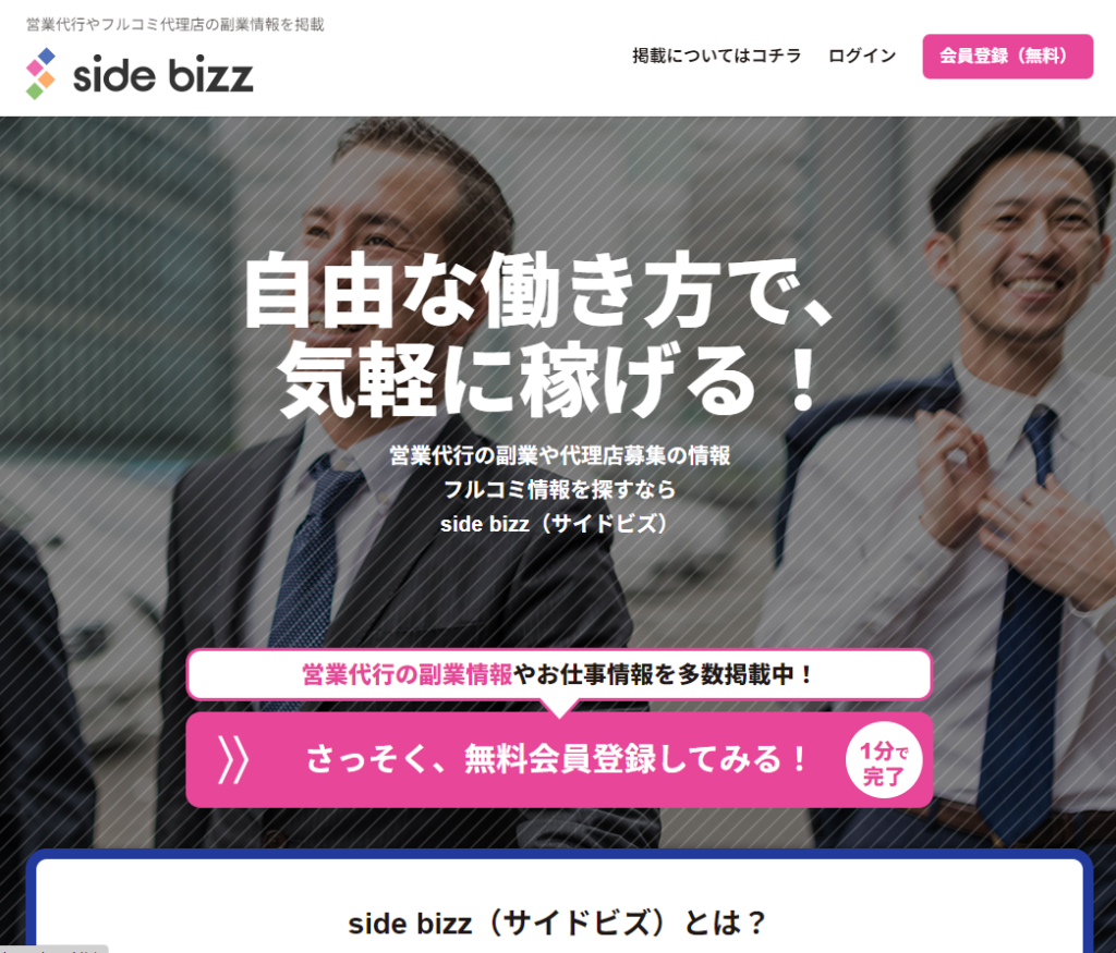 side bizzは、営業代行会社の仕事探しに特化した会員制プラットフォームです。副業として気軽にできるものからフルコミットが求められる本格的な営業まで幅広い営業案件がそろっており、希望の働き方に応じて案件を探せます。