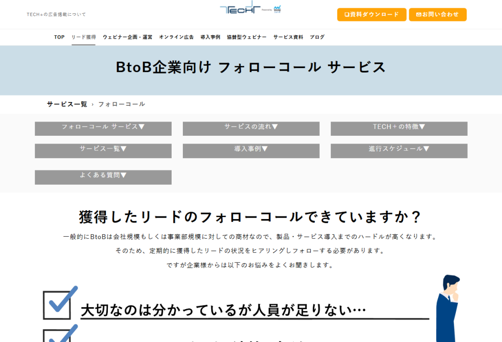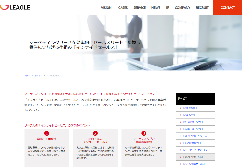 マーケティング部門が獲得したリード(見込み顧客)に対して、営業部門へつなぐ「橋渡し」の役割を担うのが特徴です。営業効率を高めたい企業や、内製リソースが不足している企業にとっては、導入メリットの大きい支援手段です。